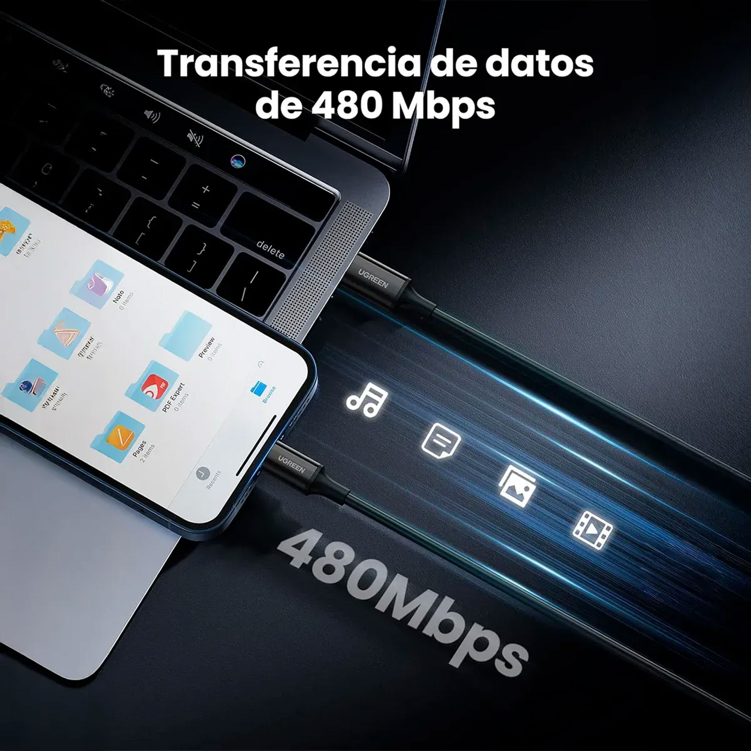 El cable UGREEN USB-C a Lightning permite carga rápida y transferencia de datos confiable entre dispositivos Apple y fuentes USB-C. Con 1 metro de longitud y conectores de alta calidad, ofrece durabilidad y rendimiento estable para uso diario.