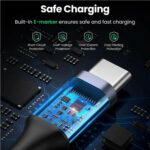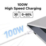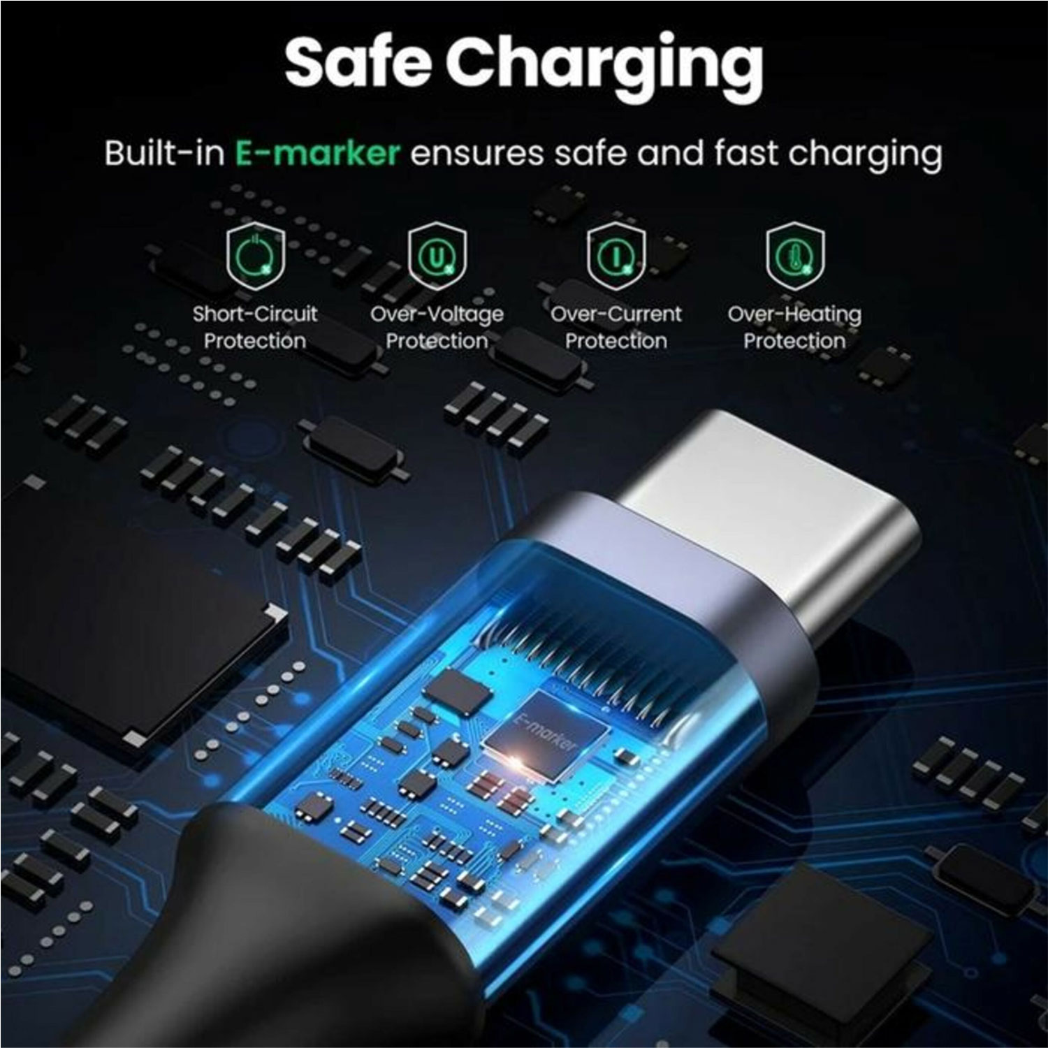 El cable UGREEN USB-C trenzado permite carga rápida y transferencia de datos eficiente entre dispositivos USB-C, soportando hasta 100W de potencia y 5A de corriente. Su diseño trenzado garantiza durabilidad y resistencia al desgaste en el uso diario.