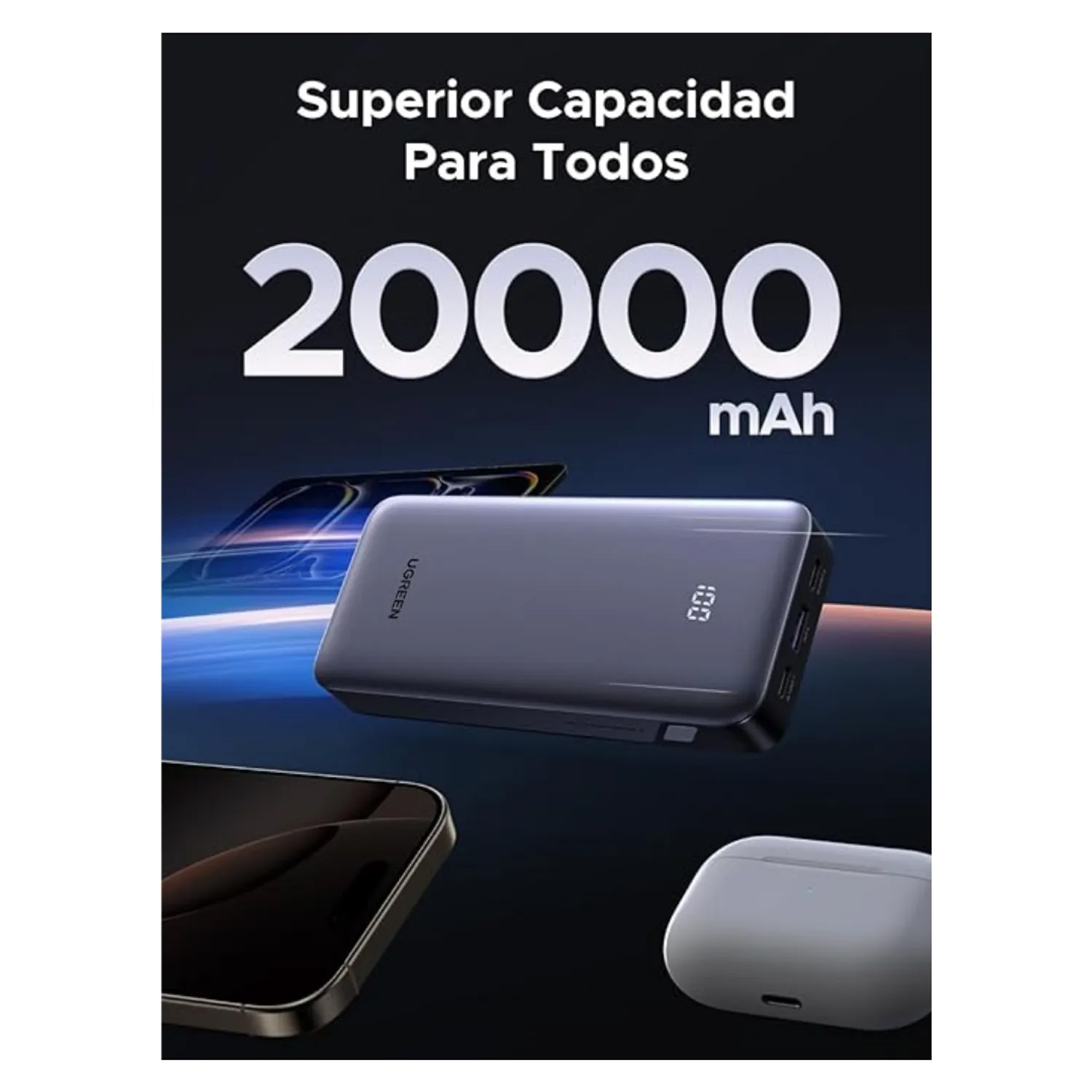 Pila portátil ugreen adopta el indicador digital de potencia para captar con precisión el estado de la alimentación y evitar la ansiedad por la energía en momentos críticos. También permite alimentar pequeños dispositivos y auriculares/ventiladores en cualquier momento