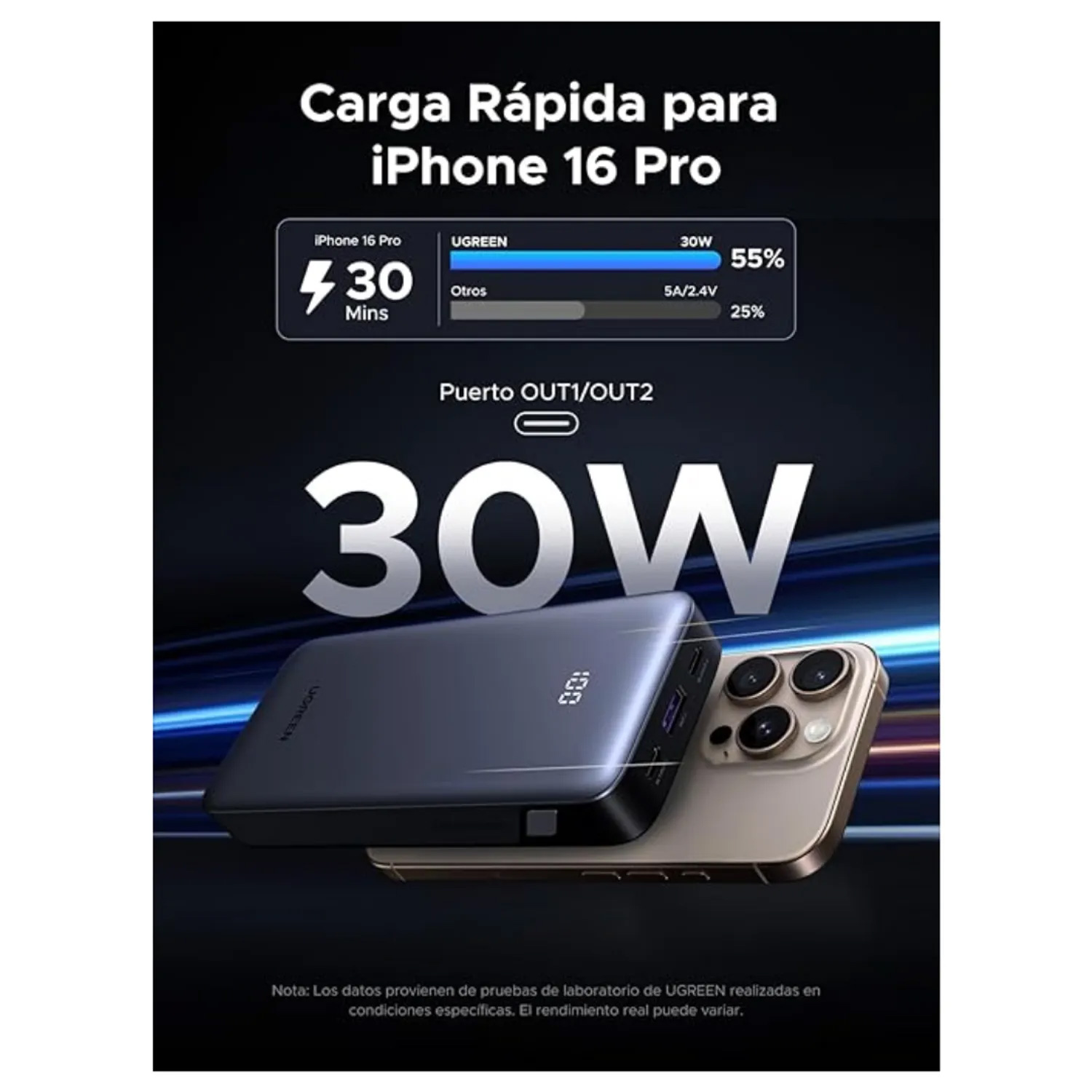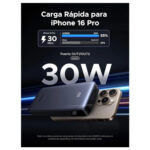 Power bank carga rapida soporta los protocolos PD/PPS 33W/QC/UFCS/FCP/SCP/AFC, se adapta inteligentemente a la velocidad de carga de su dispositivo para cargar su teléfono y tableta rápidamente. Un solo puerto de salida de 30W de potencia, puede cargar su iPhone 16 Pro 55% en 30 minutos