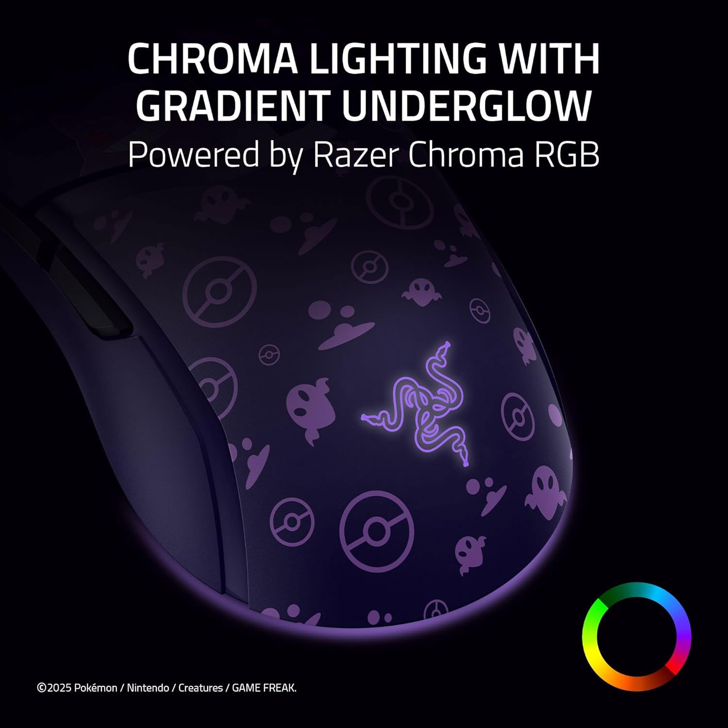 Incorpora un esquema de color púrpura característico de Gengar con gráficos sutiles del Pokémon en la superficie. La iluminación Razer Chroma RGB con efecto de resplandor inferior (underglow) permite personalizar 16.8 millones de colores y sincronizarlos con juegos compatibles .